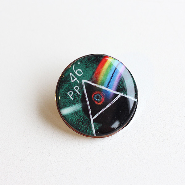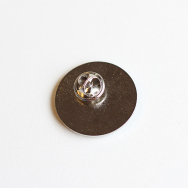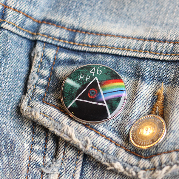 Metalowa przypinka, ozdobiona elementem grafiki 46. Przeglądu Piosenki Aktorskiej.