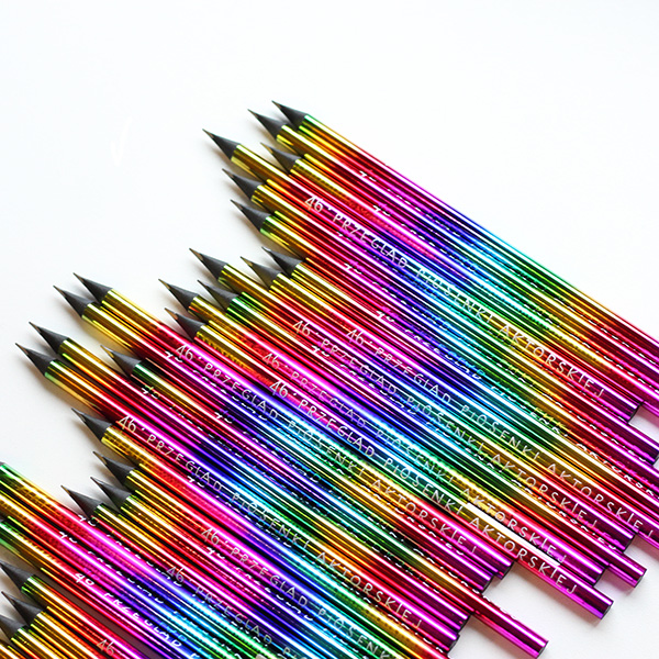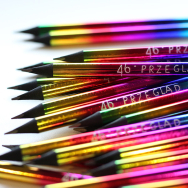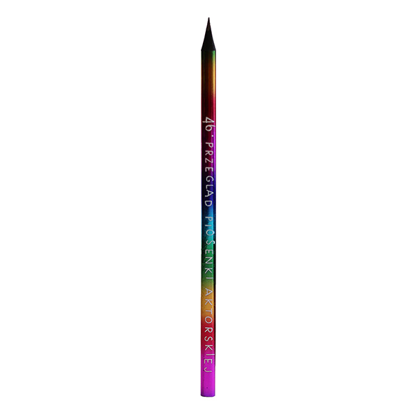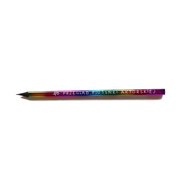Klasyczny, drewniany ołówek, o ergonomicznym, wygodnym kształcie. Tęczowy motyw nawiązuje do grafiki i plakatu 46. PPA.